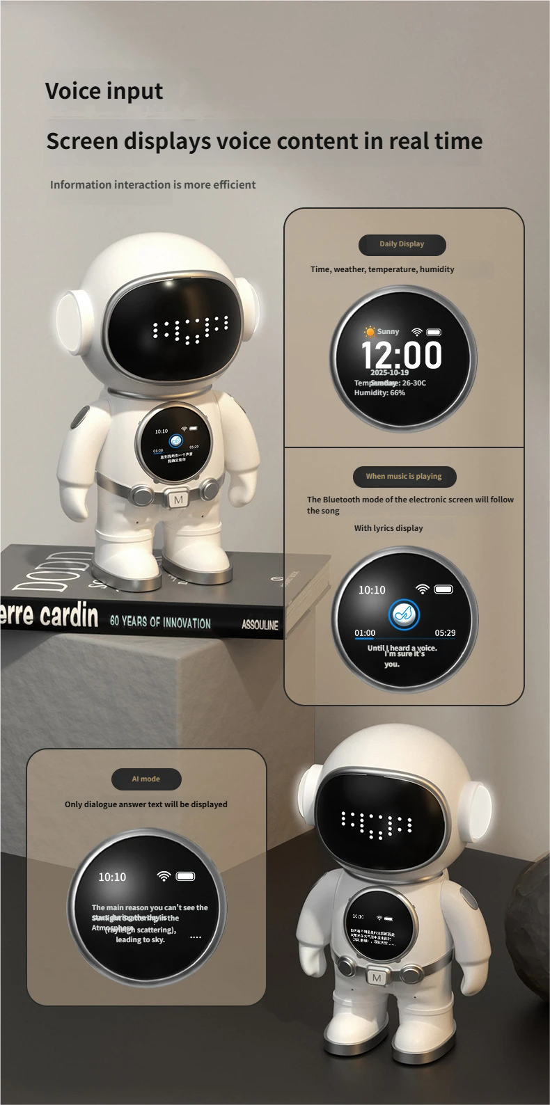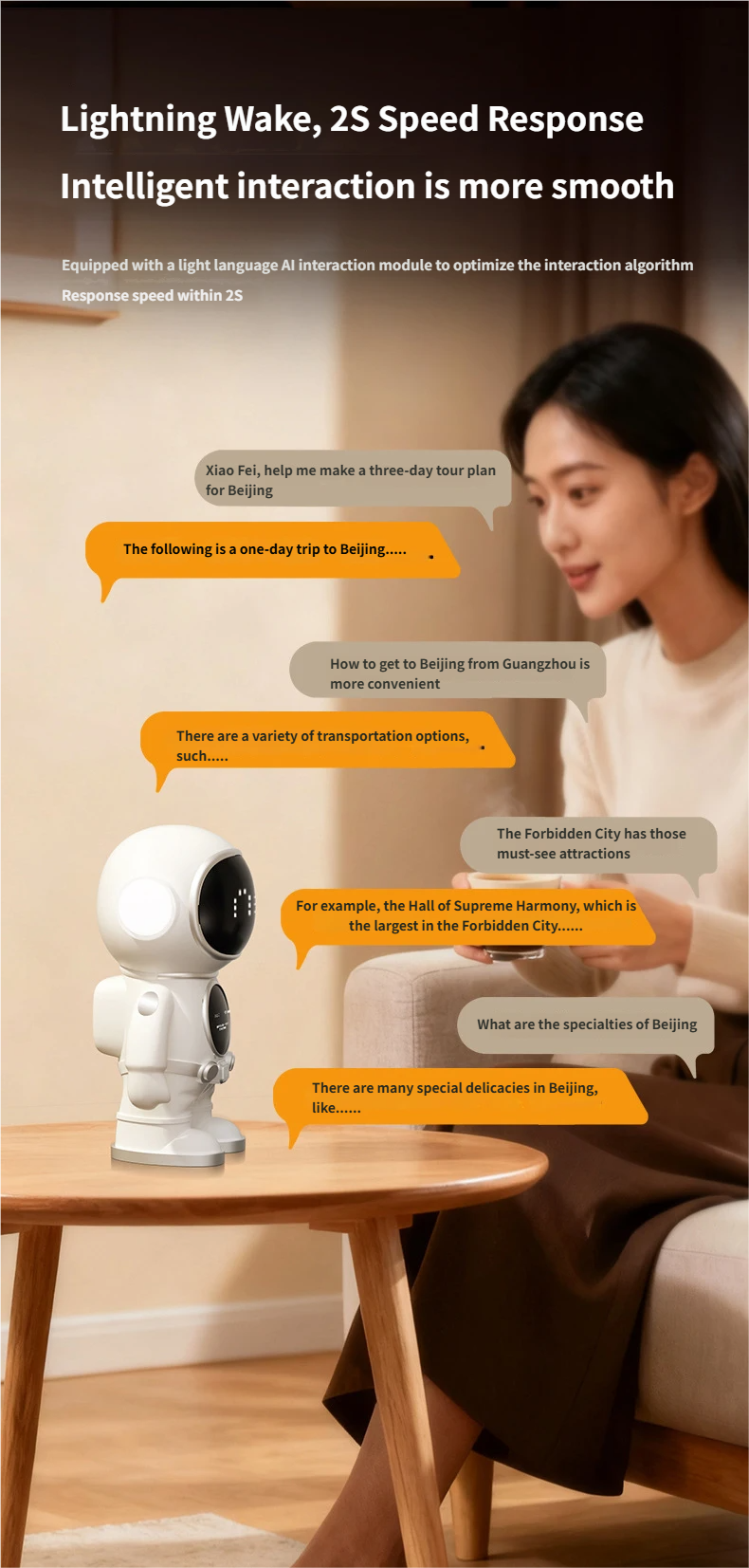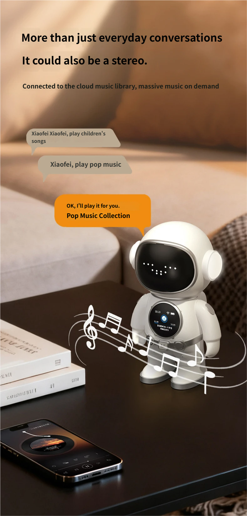 Supports chat interaction, over 50 languages, rich intelligent emoticon communication, and playback of any songs.