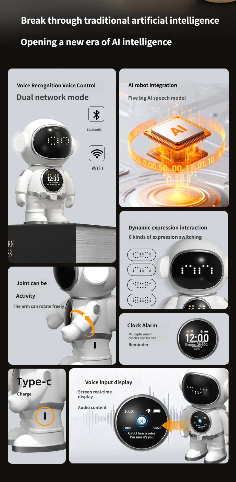 Specific Functions: Bluetooth, electric power, recording, flash lamp, LCD screen, rechargeable, parent-child games, WIFI support, voice recognition, music/sound generation, touch response.