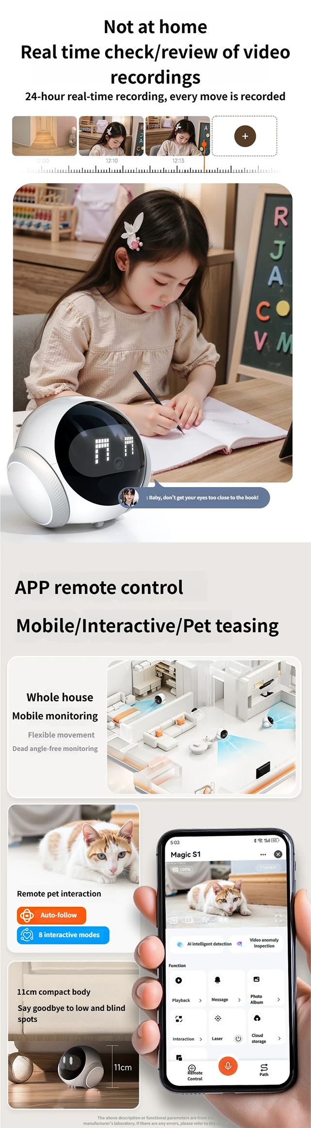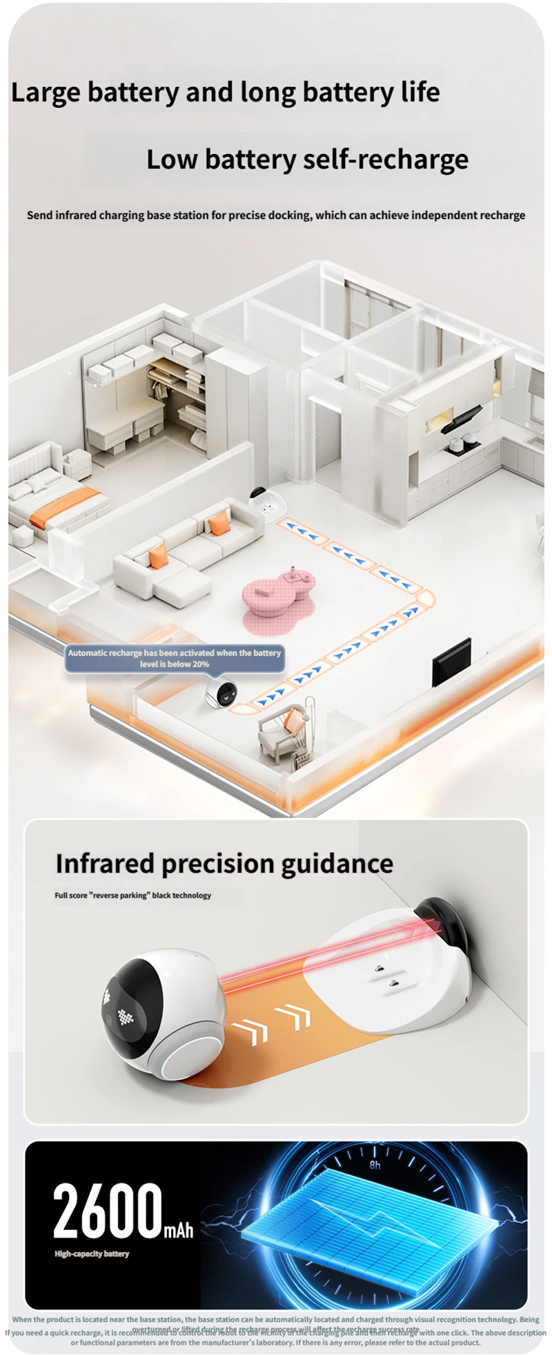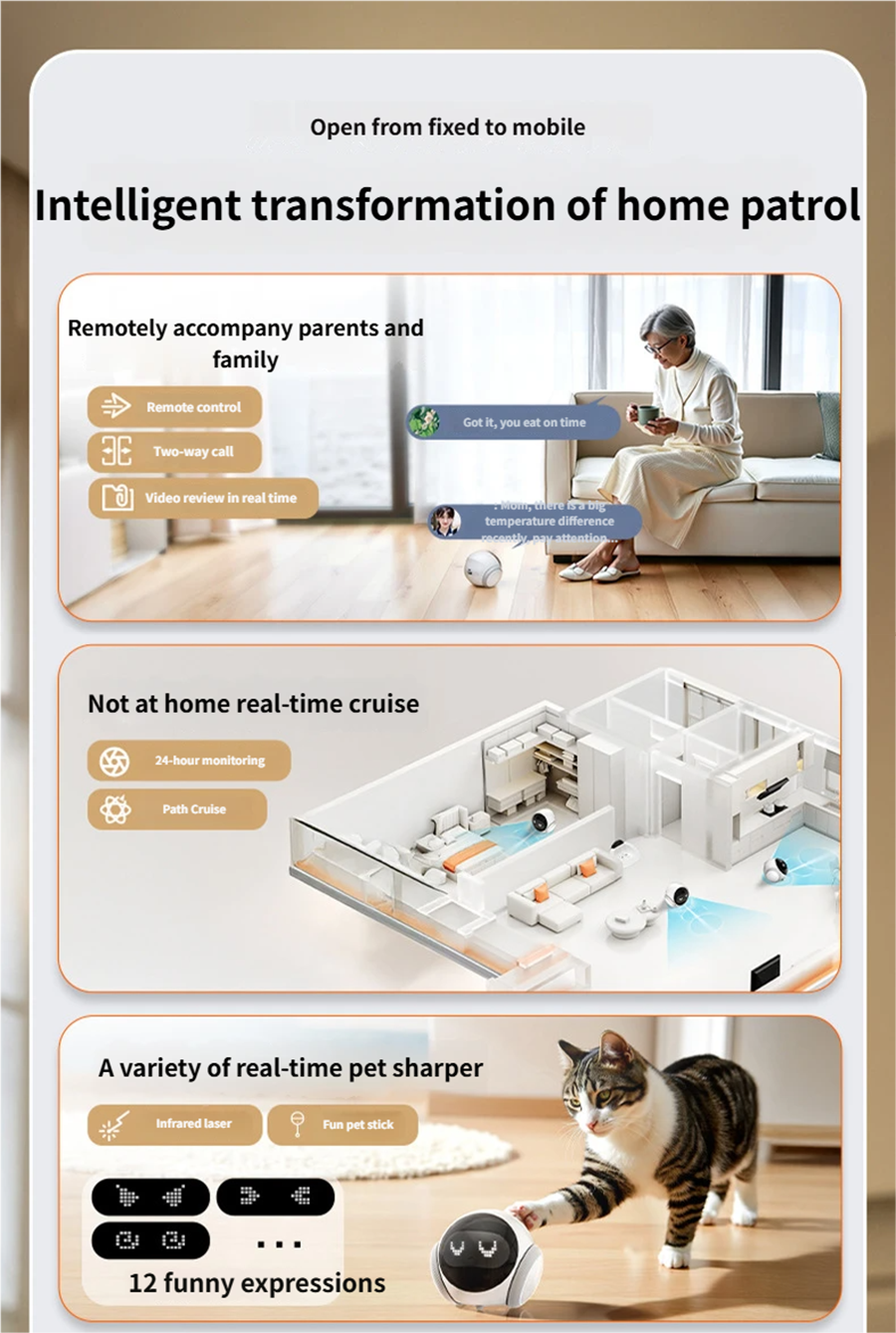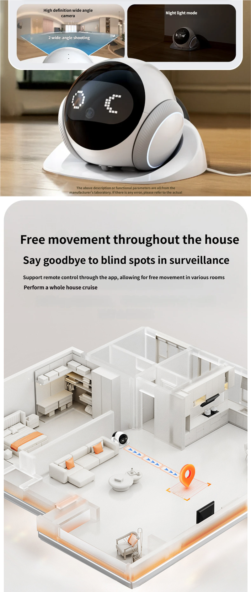 Mobile remote control/real-time monitoring/automatic recharging/anti-tipping,, 360° no dead angle, mobile remote control, a great helper for all-day care of the elderly, children and pets.